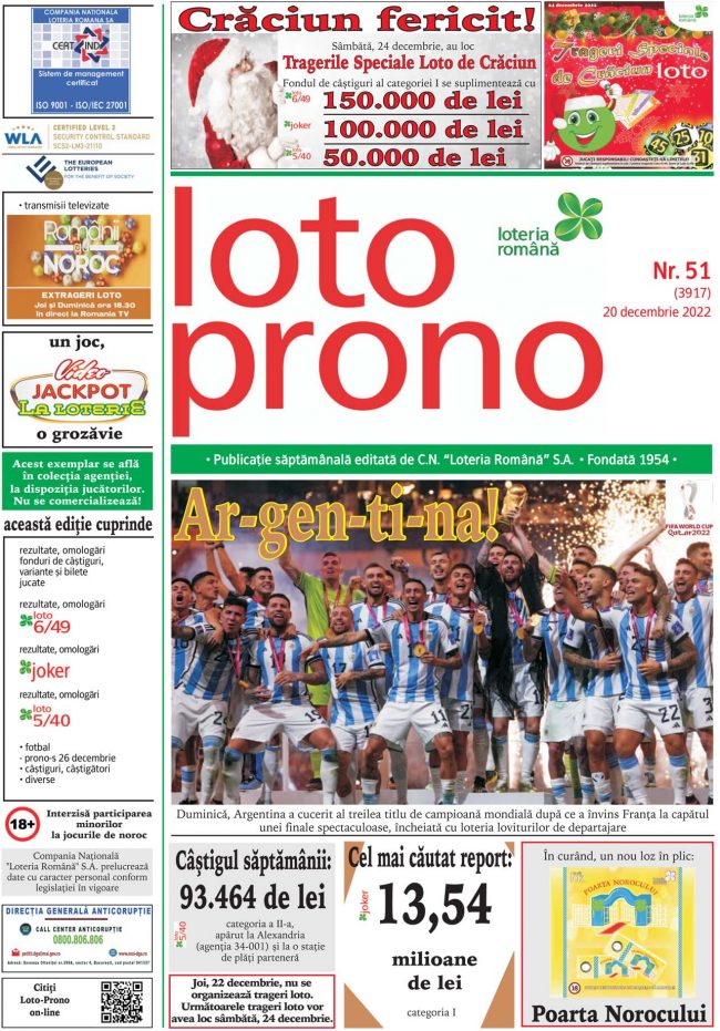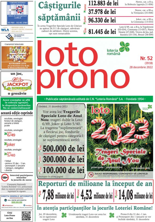 Sambata, 24 decembrie 2022, in direct, pe Romania Tv, incepand cu ora 18:30 Loteria Romana suplimenteaza fondul de castiguri al categoriei I: LOTO 6/49 – 150.000 de lei JOKER – 100.000 de lei LOTO 5/40 – 50.000 lei TRAGERILE LOTO SE VOR DIFUZA, IN DIRECT, PE ROMANIA TV, IN CADRUL EMISIUNII “ROMANII AU…