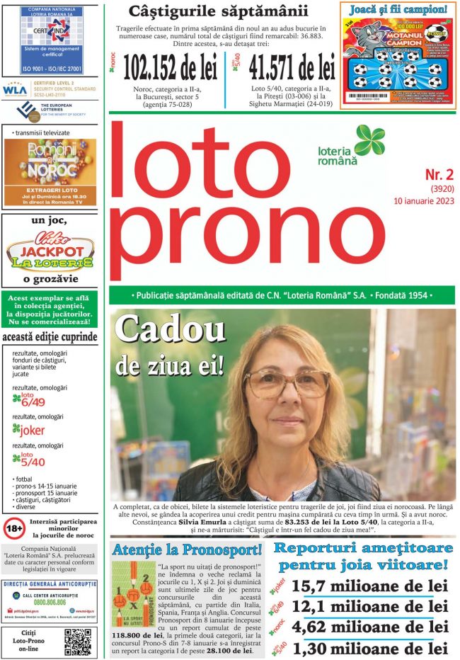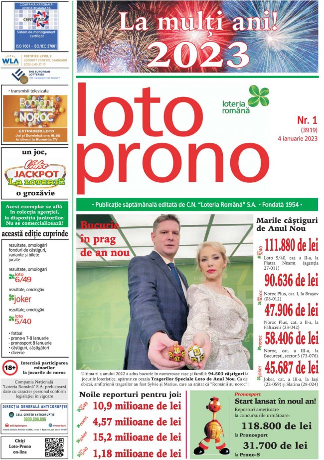 Report la Loto 6/49 la categoria I de peste 2,31 milioane de euro TRAGERILE LOTO SE VOR DIFUZA, IN DIRECT, PE ROMANIA TV, IN CADRUL EMISIUNII “ROMANII AU NOROC”, INCEPAND CU ORA 18:30 Duminica, 8 ianuarie, vor avea loc noi trageri Loto 6/49, Noroc, Joker, Noroc Plus, Loto 5/40 si Super Noroc, dupa ce la…