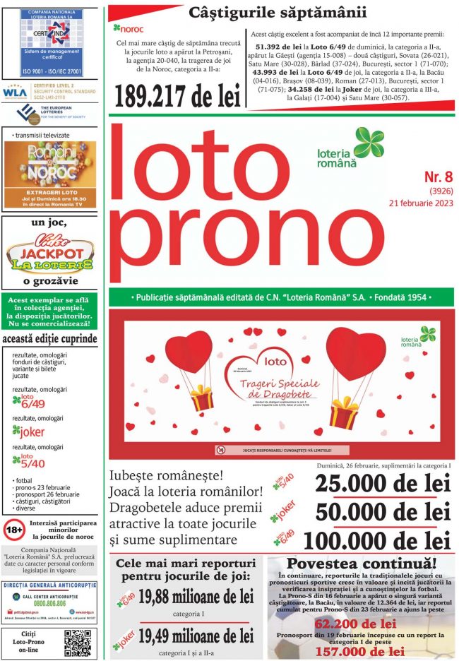 Duminica, 26 februarie, in direct, pe Romania Tv, incepand cu ora 18:30 Loteria Romana suplimenteaza fondul de castiguri al categoriei I: LOTO 6/49 – 100.000 de lei JOKER – 50.000 de lei LOTO 5/40 – 25.000 lei TRAGERILE LOTO SE VOR DIFUZA, IN DIRECT, PE ROMANIA TV, IN CADRUL EMISIUNII “ROMANII AU NOROC”, INCEPAND CU…