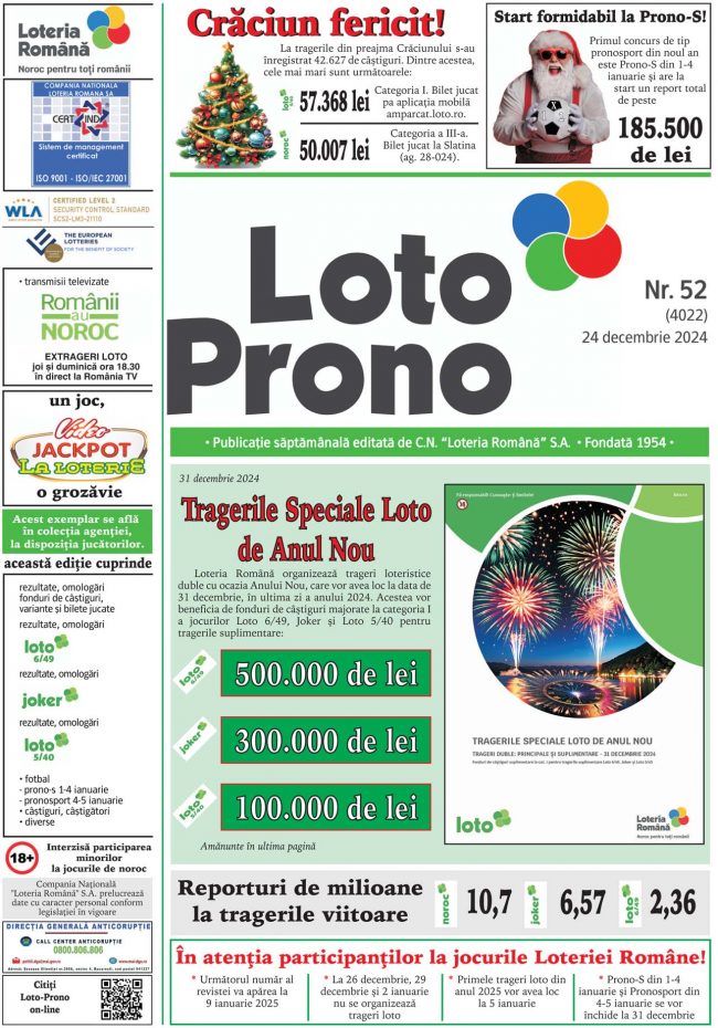 Marti, 31 decembrie, in direct pe Romania Tv, incepand cu ora 17:40 Trageri duble pentru jocurile Loto 6/49, Joker si Loto 5/40 TRAGERILE LOTO SE VOR DIFUZA, IN DIRECT, PE ROMANIA TV, IN CADRUL EMISIUNII “ROMANII AU NOROC”, INCEPAND CU ORA 17:40 Marti, 31 decembrie, Loteria Romana organizeaza TRAGERILE SPECIALE LOTO DE ANUL NOU.…