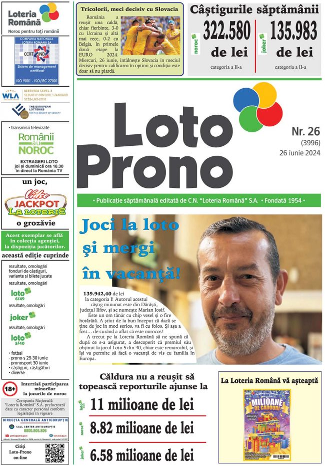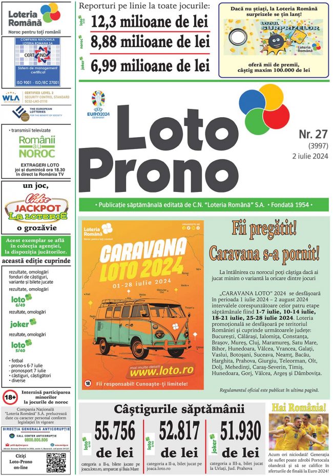 In perioada 1 iulie – 28 iulie a.c. Loteria Romana organizeaza loteria promotionala ”CARAVANA LOTO” 2024. In plin sezon estival, CARAVANA LOTO 2024 calatoreste prin tara pentru a surprinde cu premii jucatorii la Loto 6/49, Joker si Loto 5/40. Loteria Romana pune in joc 94 de premii in valoare totala de maxim 28.200 de lei…