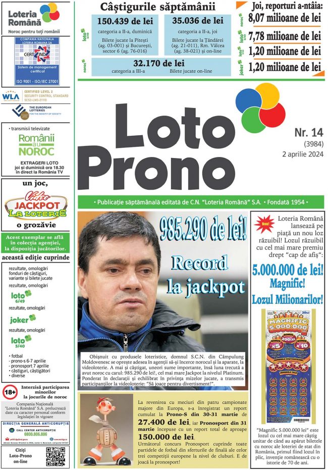 Premiul cap de afis este de 5.000.000 lei + multe alte premii de la 20 la 5.000.000 lei comunicat lansare loz