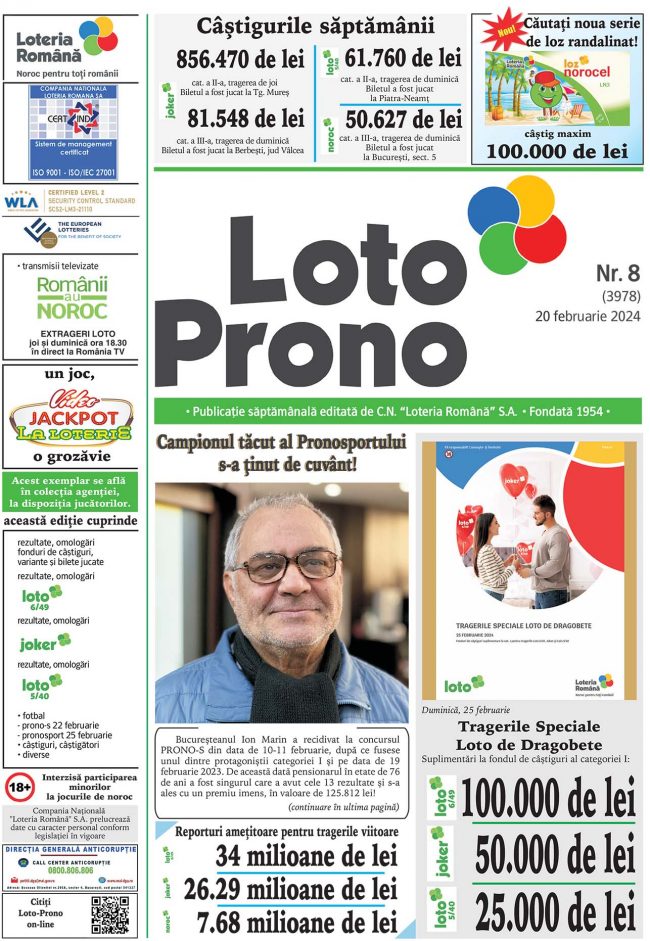 Report la Joker la categoria I de peste 5,28 milioane de euro Report cumulat la Noroc de peste 1,68 milioane de euro TRAGERILE LOTO SE VOR DIFUZA, IN DIRECT, PE ROMANIA TV, IN CADRUL EMISIUNII “ROMANII AU NOROC”, INCEPAND CU ORA 18:30 Joi, 22 februarie, vor avea loc noi trageri Loto 6/49, Noroc, Joker, Noroc…