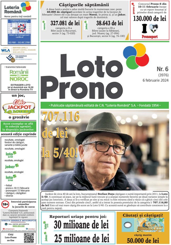 Report la Joker la categoria I de peste 5,07 milioane de euro Report cumulat la Noroc de peste 1,62 milioane de euro TRAGERILE LOTO SE VOR DIFUZA, IN DIRECT, PE ROMANIA TV, IN CADRUL EMISIUNII “ROMANII AU NOROC”, INCEPAND CU ORA 18:30 Duminica, 11 februarie, vor avea loc noi trageri Loto 6/49, Noroc, Joker, Noroc…