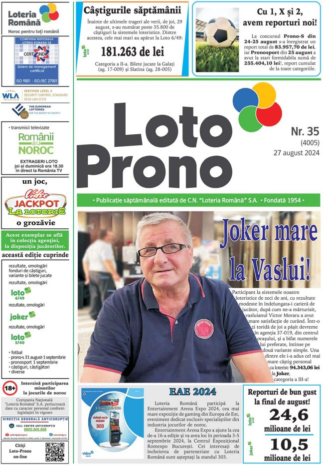Report cumulat la Noroc de peste 1,99 milioane de euro Report la Joker la categoria I de peste 2,15 milioane de euro TRAGERILE LOTO SE VOR DIFUZA, IN DIRECT, PE ROMANIA TV, IN CADRUL EMISIUNII “ROMANII AU NOROC”, INCEPAND CU ORA 18:30. Duminica, 1 septembrie, vor avea loc noi trageri Loto 6/49, Noroc, Joker, Noroc…