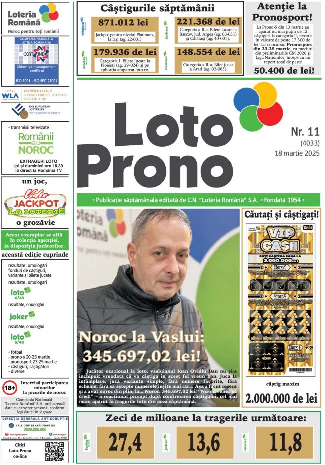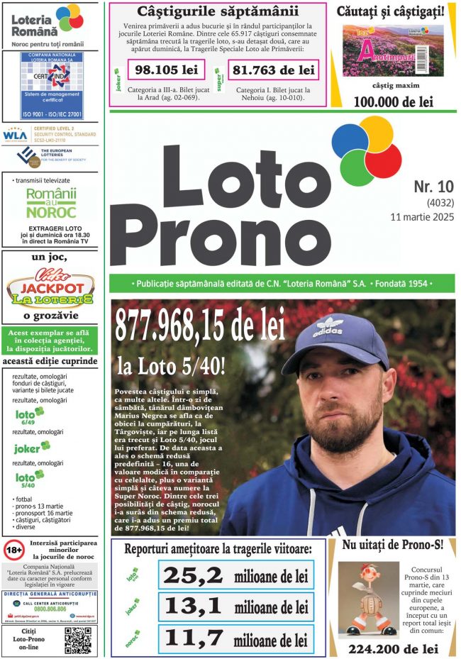 Report cumulat la Noroc de peste 2,62 milioane de euro Report la Joker la categoria I de peste 2,68 milioane de euro La tragerile loto de joi, 13 martie, Loteria Romana a acordat peste 26.600 de castiguri in valoare totala de peste 1,81 milioane de lei. La Loto 6/49 se inregistreaza la categoria I un…