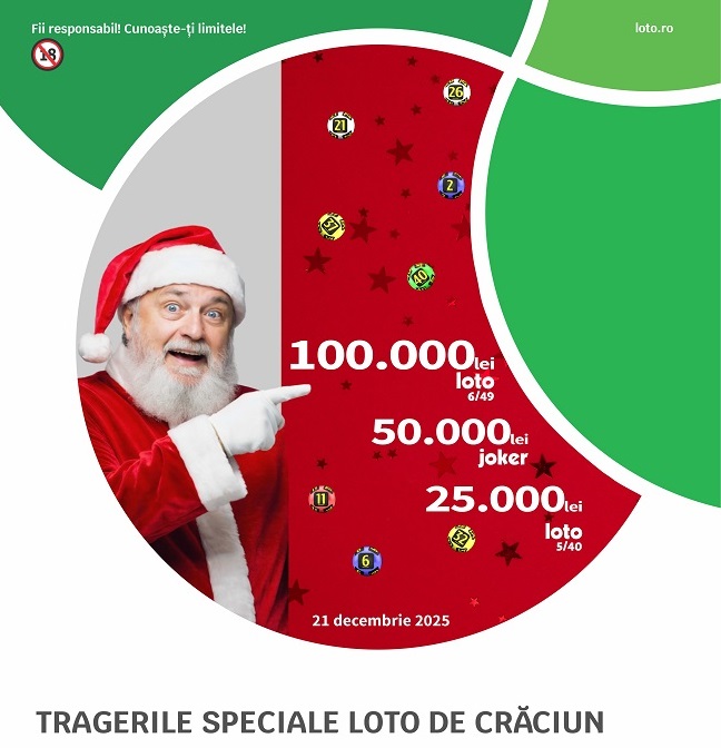 TRAGERILE LOTO SE VOR DIFUZA, IN DIRECT, PE ROMANIA TV, IN CADRUL EMISIUNII “ROMANII AU NOROC”, INCEPAND CU ORA 18:30. Loteria Romana organizeaza duminica, 21 decembrie, TRAGERILE SPECIALE LOTO DE CRĂCIUN. Pentru aceste trageri, Loteria Romana suplimenteaza fondul de castiguri al categoriei I pentru jocurile Loto 6/49, Joker si Loto 5/40, dupa cum urmeaza: …