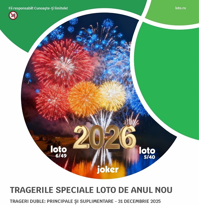 Miercuri, 31 decembrie, in direct pe Romania Tv, incepand cu ora 17:40 Trageri duble pentru jocurile Loto 6/49, Joker si Loto 5/40 TRAGERILE LOTO SE VOR DIFUZA, IN DIRECT, PE ROMANIA TV, IN CADRUL EMISIUNII “ROMANII AU NOROC”, INCEPAND CU ORA 17:40 Loteria Romana organizeaza miercuri, 31 decembrie, TRAGERILE SPECIALE LOTO DE ANUL NOU. Pentru…