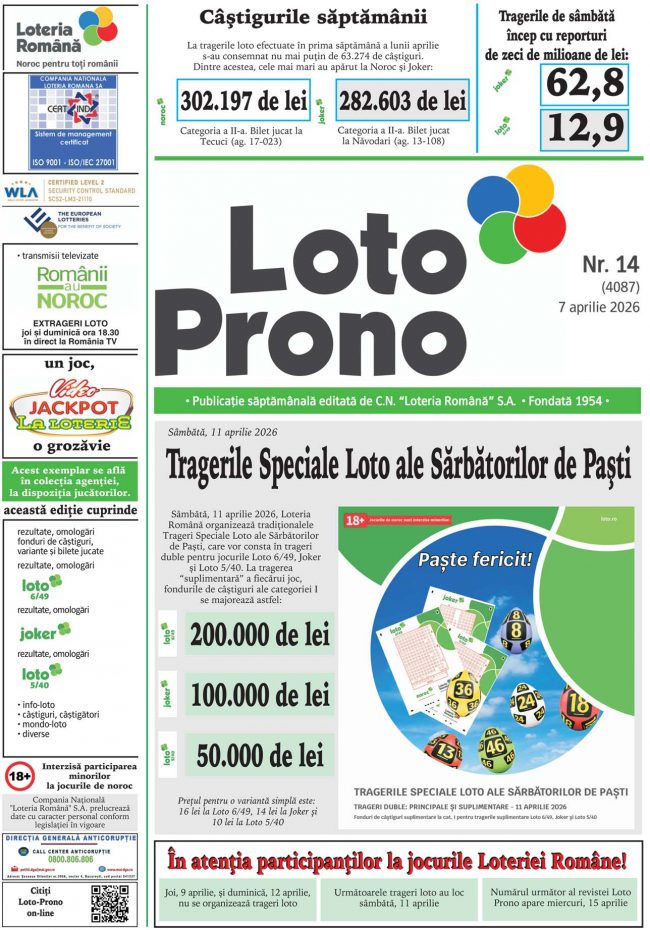 SAMBATA, 11 APRILIE, in direct pe Romania TV, incepand cu ora 18:30 Trageri duble pentru jocurile Loto 6/49, Joker si Loto 5/40 TRAGERILE SPECIALE LOTO ALE SARBATORILOR DE PASTI SE VOR DIFUZA, IN DIRECT, PE ROMANIA TV, IN CADRUL EMISIUNII “ROMANII AU NOROC”, SAMBATA, 11 APRILIE, INCEPAND CU ORA 18:30. IMPORTANT ! Joi, 9 aprilie…