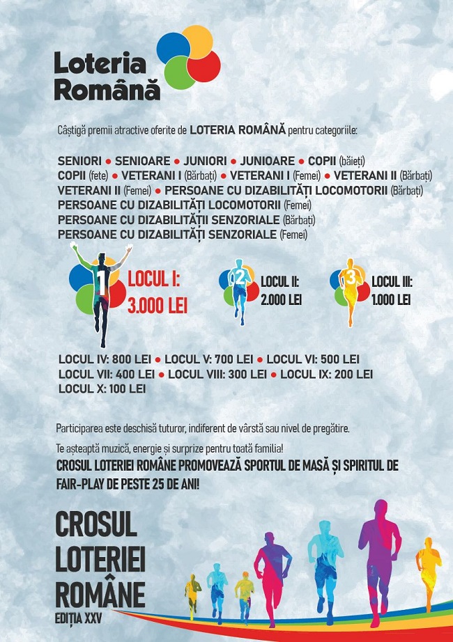 Loteria Romana va premia primele 10 locuri pentru categoriile SENIORI/SENIOARE, JUNIORI/JUNIOARE, COPII BAIETI/FETE, VETERANI I BARBATI/FEMEI, VETERANI II BARBATI/FEMEI, PERSOANE CU DIZABILITATI LOCOMOTORII BARBATI/FEMEI, PERSOANE CU DIZABILITATI SENZORIALE BARBATI/FEMEI, in functie de timpul obtinut, dupa cum urmeaza: