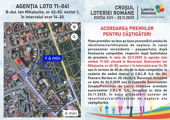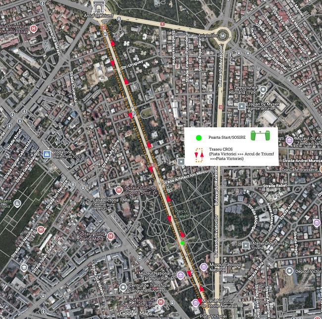 - in ziua desfasurarii competitiei – 22.11.2025, in intervalul orar 8:00 – 11:00, la punctele special amenajate in Bucuresti – Soseaua Kiseleff, amplasate in zona PIATETA REGELUI.