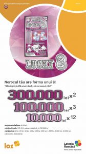 Lozul LUCKY 8, care poate fi achiziționat din orice agenție loto cu numai 8 lei, are trei zone de joc și un design atractiv, în patru variante de culori. Valoarea totală a premiilor puse în joc de LOTERIA ROMÂNĂ pentru acest nou produs loteristic este de 14,72 milioane de lei, iar cele 975.741 de câștiguri sunt distribuite în premii cu valori de 8 lei, 20 lei, 30 lei, 50 lei, 100 lei, 500 lei, 1.000 lei, 5.000 lei, 10.000 lei, 100.000 lei și 300.000 lei.