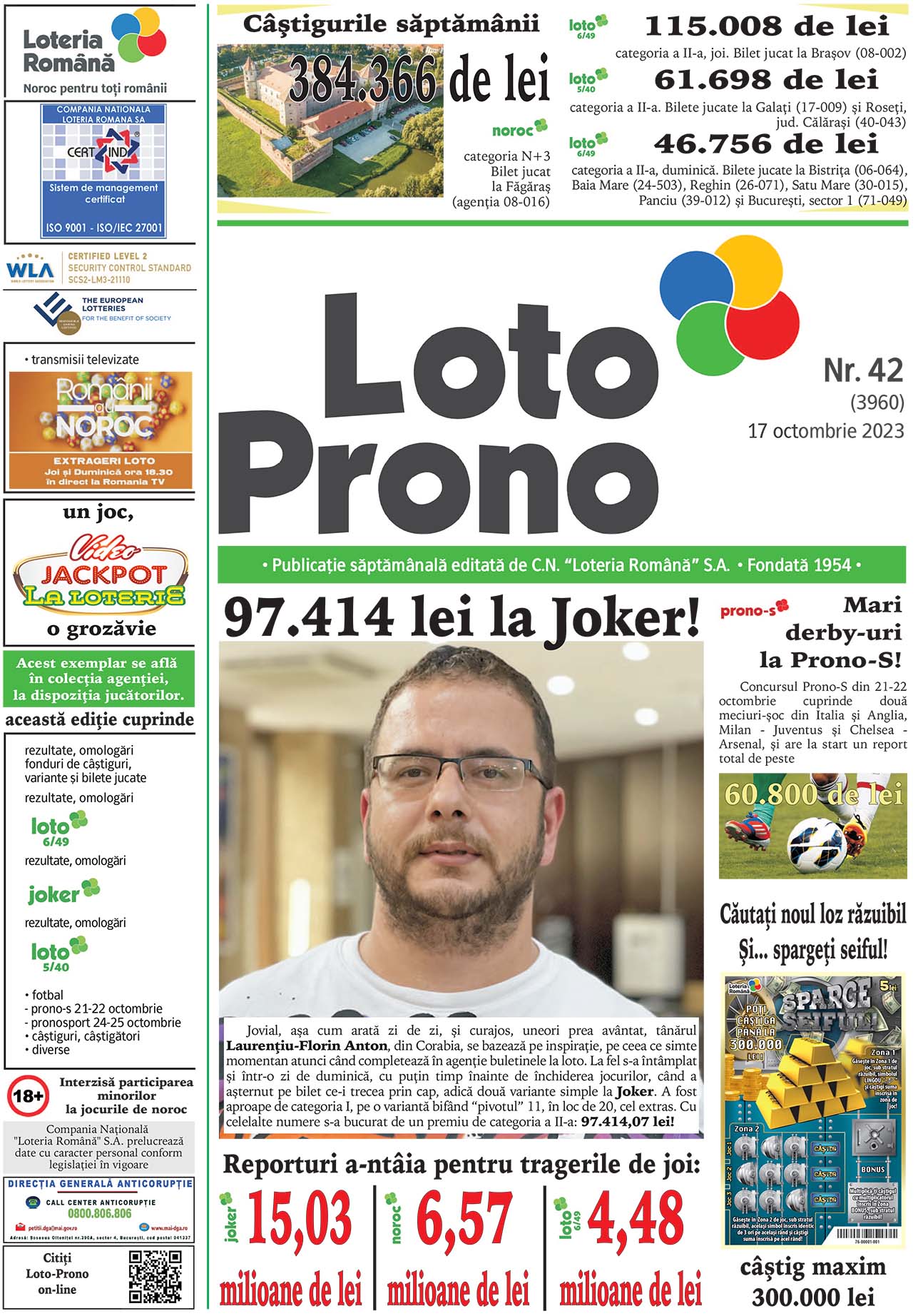 Report cumulat la Noroc de peste 1,51 milioane de euro TRAGERILE LOTO SE VOR DIFUZA, IN DIRECT, PE ROMANIA TV, IN CADRUL EMISIUNII “ROMANII AU NOROC”, INCEPAND CU ORA 18:30 Joi, 19 octombrie, vor avea loc noi trageri Loto 6/49, Noroc, Joker, Noroc Plus, Loto 5/40 si Super Noroc, dupa ce la tragerile loto de…