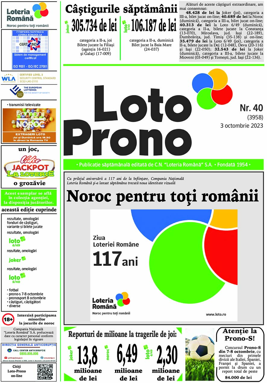 DetailsReport cumulat la Noroc de peste 1,52 milioane de euro TRAGERILE LOTO SE VOR DIFUZA, IN DIRECT, PE ROMANIA TV, IN CADRUL EMISIUNII “ROMANII AU NOROC”, INCEPAND CU ORA 18:30 Duminica, 1 octombrie, vor avea loc noi trageri Loto 6/49, Noroc, Joker, Noroc Plus, Loto 5/40 si Super Noroc, dupa ce la tragerile loto de…