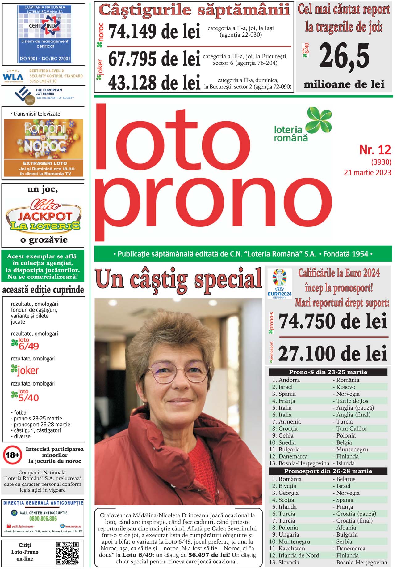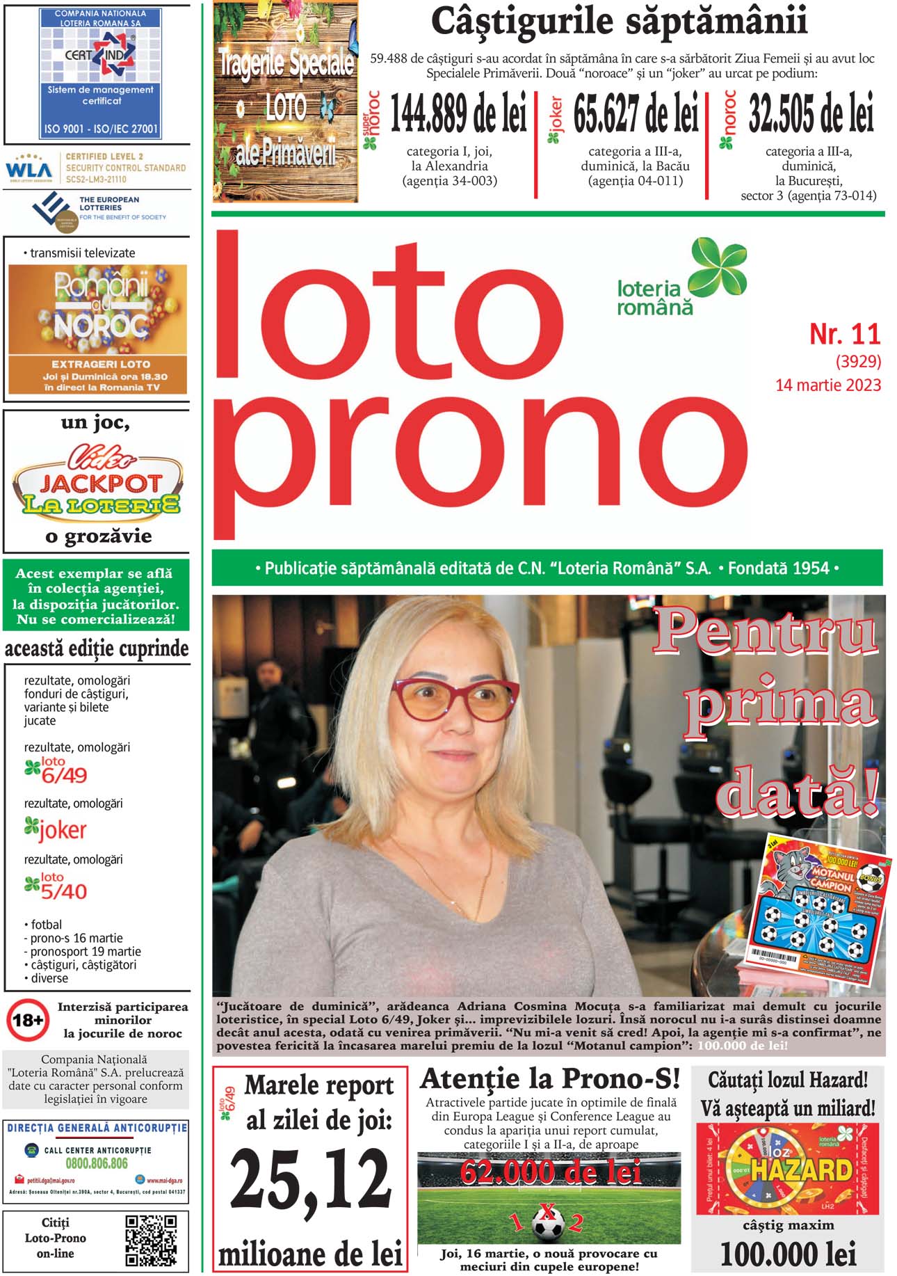 Report cumulat la Noroc de peste 1,18 milioane de euro TRAGERILE LOTO SE VOR DIFUZA, IN DIRECT, PE ROMANIA TV, IN CADRUL EMISIUNII “ROMANII AU NOROC”, INCEPAND CU ORA 18:30 Duminica, 19 martie, vor avea loc noi trageri Loto 6/49, Noroc, Joker, Noroc Plus, Loto 5/40 si Super Noroc, dupa ce la tragerile loto de…