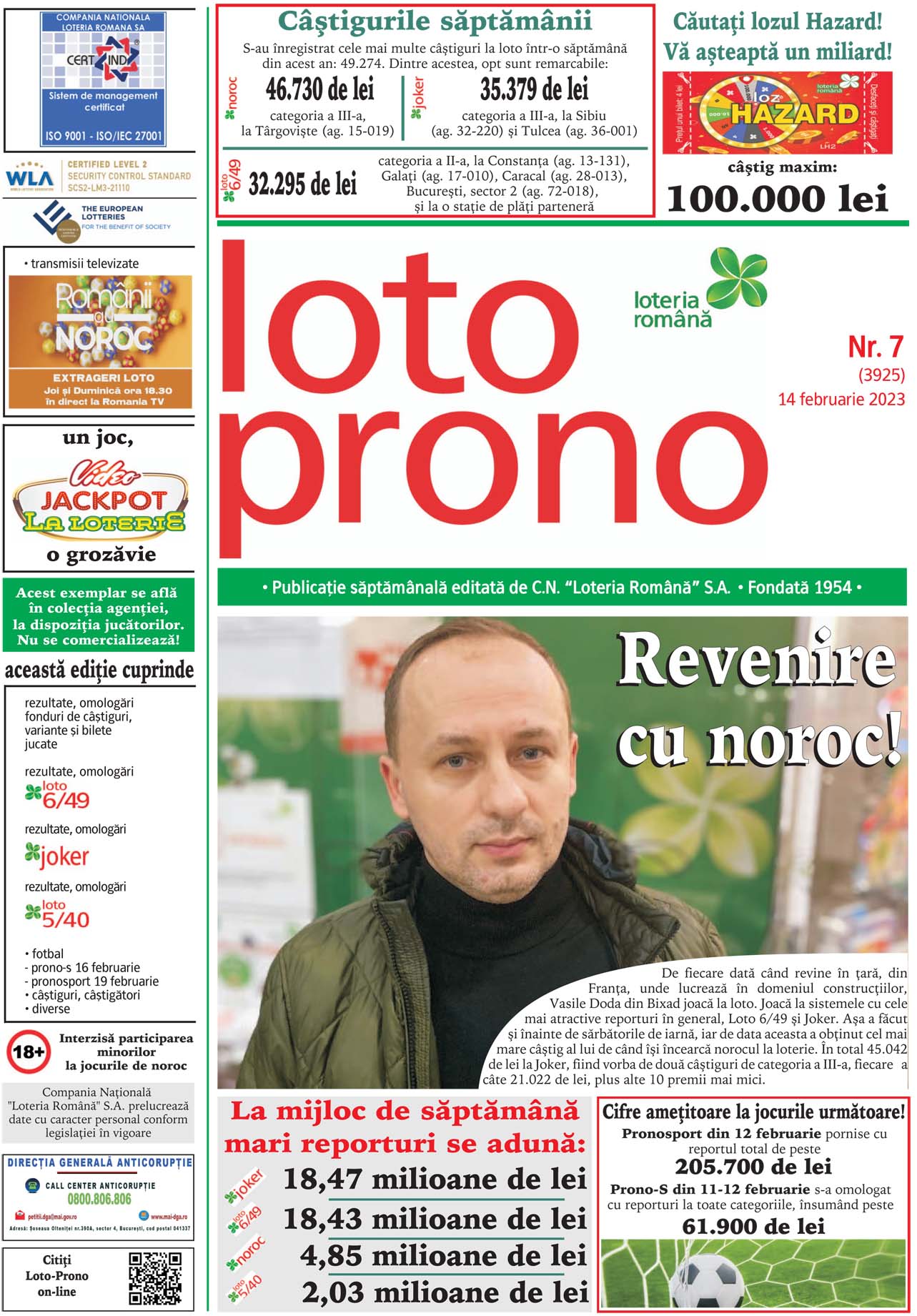 DetailsReport la Joker la categoria I de peste 3,76 milioane de euro TRAGERILE LOTO SE VOR DIFUZA, IN DIRECT, PE ROMANIA TV, IN CADRUL EMISIUNII “ROMANII AU NOROC”, INCEPAND CU ORA 18:30 Joi, 16 februarie, vor avea loc noi trageri Loto 6/49, Noroc, Joker, Noroc Plus, Loto 5/40 si Super Noroc, dupa ce la tragerile…