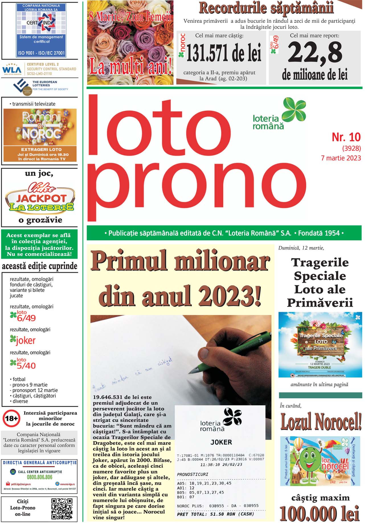 DetailsReport cumulat la Noroc de peste 1,18 milioane de euro TRAGERILE LOTO SE VOR DIFUZA, IN DIRECT, PE ROMANIA TV, IN CADRUL EMISIUNII “ROMANII AU NOROC”, INCEPAND CU ORA 18:30 Joi, 16 martie, vor avea loc noi trageri Loto 6/49, Noroc, Joker, Noroc Plus, Loto 5/40 si Super Noroc, dupa ce la Tragerile Speciale Loto…
