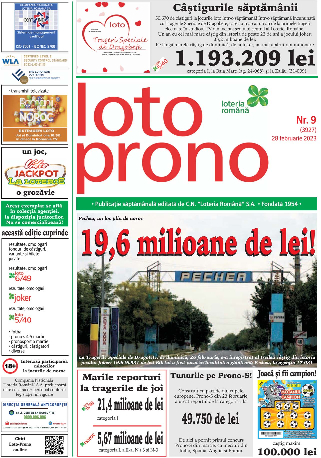 Report cumulat Noroc peste 1,15 milioane de euro TRAGERILE LOTO SE VOR DIFUZA, IN DIRECT, PE ROMANIA TV, IN CADRUL EMISIUNII “ROMANII AU NOROC”, INCEPAND CU ORA 18:30 Joi, 9 martie, vor avea loc noi trageri Loto 6/49, Noroc, Joker, Noroc Plus, Loto 5/40 si Super Noroc, dupa ce la tragerile loto de duminica, 5…