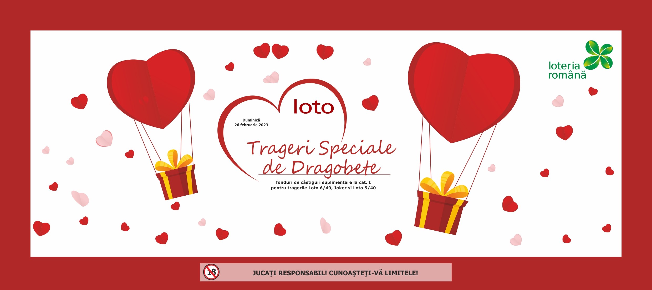 DetailsDuminica, 26 februarie, in direct, pe Romania Tv, incepand cu ora 18:30 Loteria Romana suplimenteaza fondul de castiguri al categoriei I: LOTO 6/49 – 100.000 de lei JOKER – 50.000 de lei LOTO 5/40 – 25.000 lei TRAGERILE LOTO SE VOR DIFUZA, IN DIRECT, PE ROMANIA TV, IN CADRUL EMISIUNII “ROMANII AU NOROC”, INCEPAND CU…