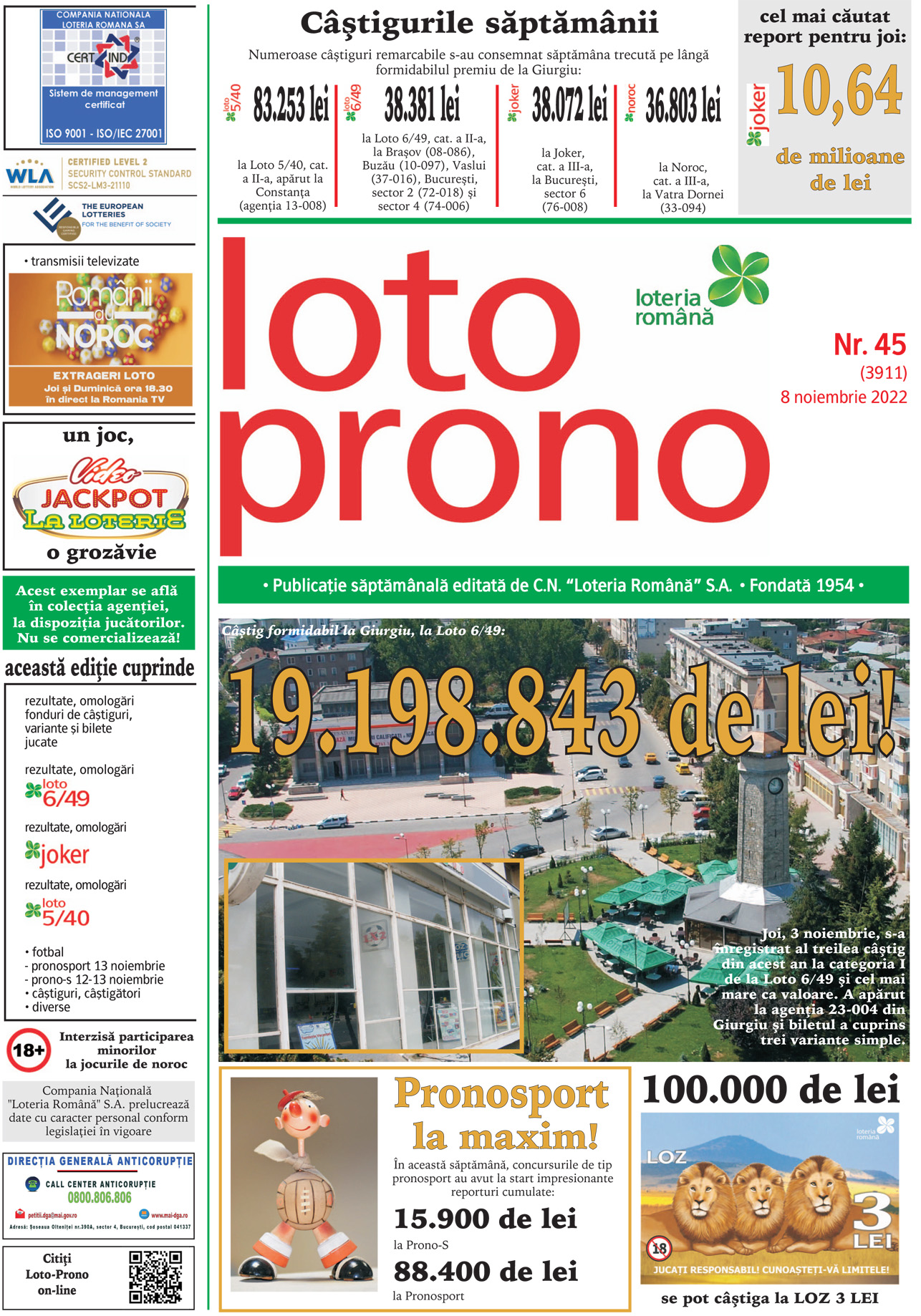 DetailsCASTIGATORUL PREMIULUI DE CATEGORIA I LA TRAGEREA LOTO 6/49 DIN 3 NOIEMBRIE SI-A RIDICAT CASTIGUL „Am jucat. Am castigat. Numai jucând veți câștiga la Loteria Română.” – este mesajul pe care castigatorul il transmite tuturor jucatorilor la loto. In cursul zilei de astazi, 8 noiembrie, s-a prezentat la sediul central al Loteriei Romane castigatorul premiului de…