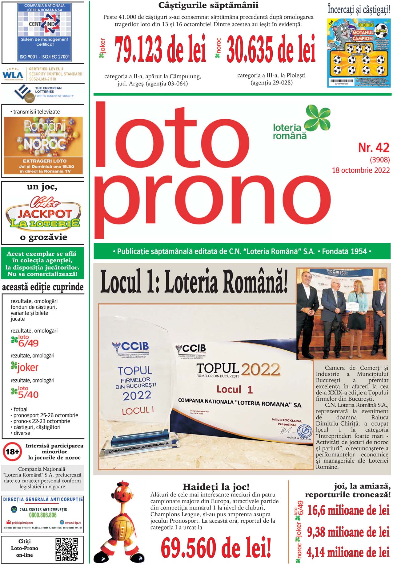 Report la Joker la categoria I de peste 1,93 milioane de euro TRAGERILE LOTO SE VOR DIFUZA, IN DIRECT, PE ROMANIA TV, IN CADRUL EMISIUNII “ROMANII AU NOROC”, INCEPAND CU ORA 18:30 Duminica, 23 octombrie, vor avea loc noi trageri Loto 6/49, Noroc, Joker, Noroc Plus, Loto 5/40 si Super Noroc, dupa ce la tragerile…
