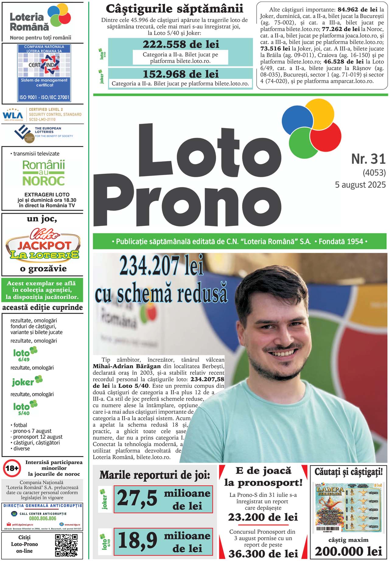 DetailsReport la Joker la categoria I de peste 5,42 milioane de euro TRAGERILE LOTO SE VOR DIFUZA, IN DIRECT, PE ROMANIA TV, IN CADRUL EMISIUNII “ROMANII AU NOROC”, INCEPAND CU ORA 18:30 Joi, 7 august, vor avea loc noi trageri Loto 6/49, Noroc, Joker, Noroc Plus, Loto 5/40 si Super Noroc, dupa ce la tragerile…