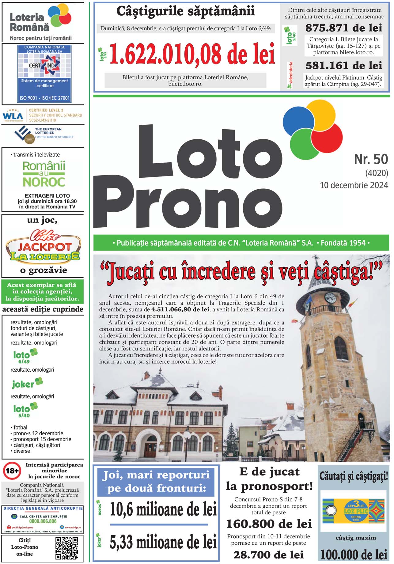 DetailsReport la Joker la categoria I de peste 1,07 milioane de euro SUPLIMENTAR 100.000 DE LEI LA CATEGORIA I LA LOTO 6/49 TRAGERILE LOTO SE VOR DIFUZA, IN DIRECT, PE ROMANIA TV, IN CADRUL EMISIUNII “ROMANII AU NOROC”, INCEPAND CU ORA 18:30 Joi, 12 decembrie, vor avea loc noi trageri Loto 6/49, Noroc, Joker, Noroc…