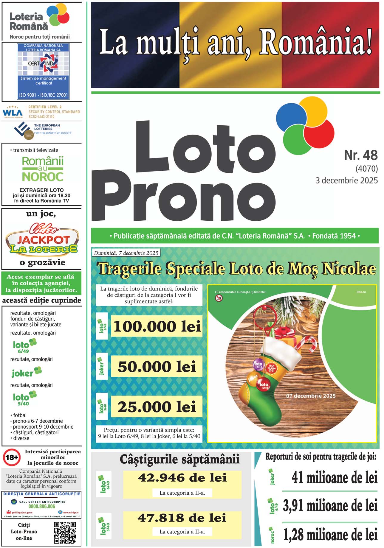 TRAGERILE LOTO SE VOR DIFUZA, IN DIRECT, PE ROMANIA TV, IN CADRUL EMISIUNII “ROMANII AU NOROC”, INCEPAND CU ORA 17:40 Loteria Romana organizeaza duminica, 7 decembrie, TRAGERILE SPECIALE LOTO DE MOS NICOLAE. Pentru aceste trageri, Loteria Romana suplimenteaza fondul de castiguri al categoriei I pentru jocurile Loto 6/49, Joker si Loto 5/40, dupa cum urmeaza:…