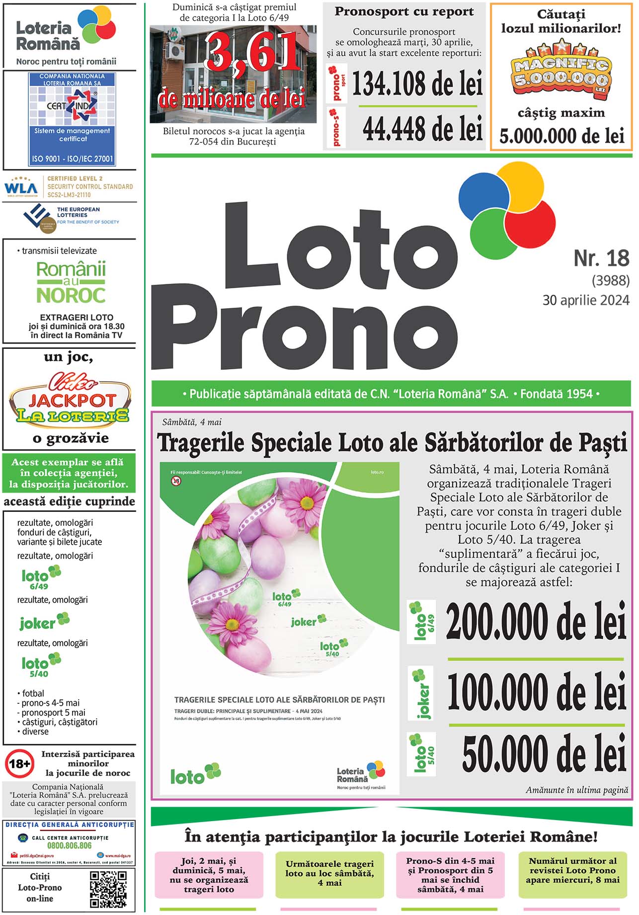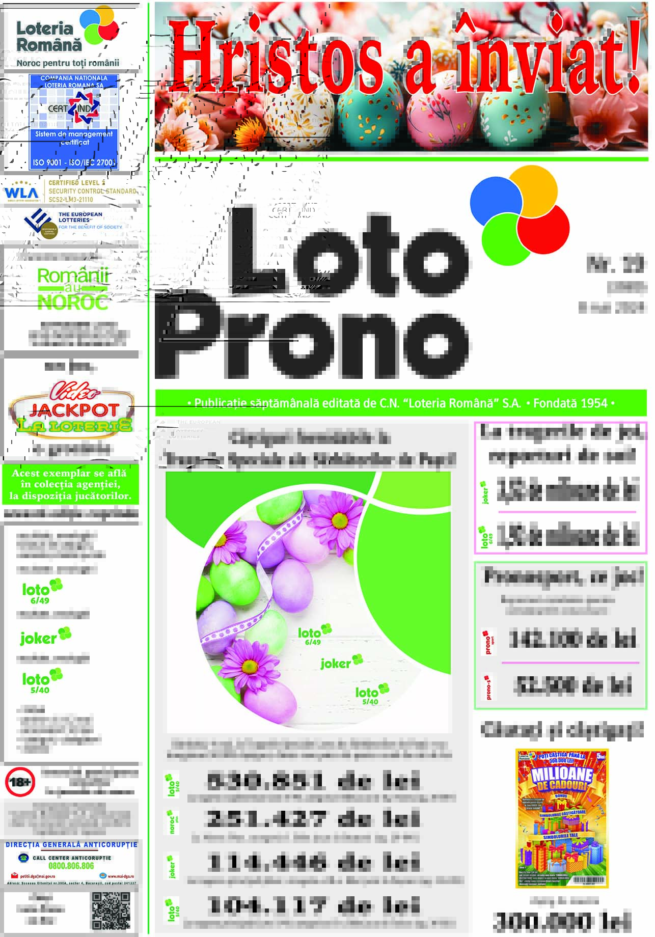 Miercuri 01.05.2024 – inchis Joi 02.05.2024 – deschis – nu au loc trageri Vineri 03.05.2024 – deschis Sambata 04.05.2024 – deschis – Tragerile Speciale Loto ale Sarbatorilor de Pasti Duminica 05.05.2024 – inchis Luni 06.05.2024 – inchis Program de lucru cu publicul Aparatul Central (Plăți premii) 01.05.2024 – 06.05.2024 – inchis