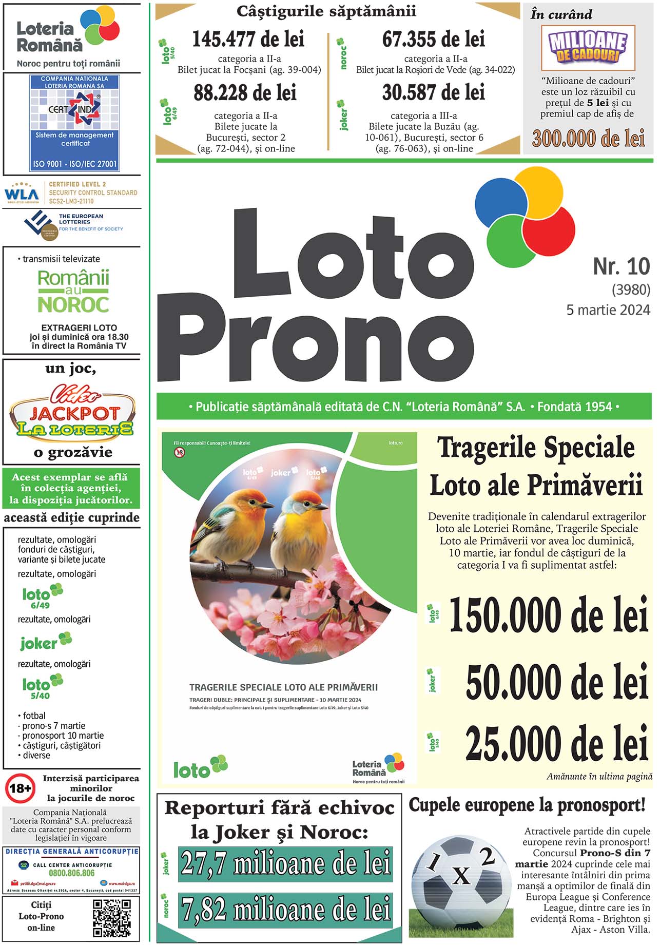 DetailsReport cumulat la Noroc de peste 1,71 milioane de euro TRAGERILE LOTO SE VOR DIFUZA, IN DIRECT, PE ROMANIA TV, IN CADRUL EMISIUNII “ROMANII AU NOROC”, INCEPAND CU ORA 18:30 Joi, 7 martie, vor avea loc noi trageri Loto 6/49, Noroc, Joker, Noroc Plus, Loto 5/40 si Super Noroc, dupa ce la tragerile loto de…