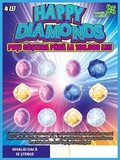 „HAPPY DIAMONDS” le da jucatorilor ocazia sa se bucure de stralucirea norocului inca de la achizitionarea sa cu numai 4 lei. Lozul razuibil care ilustreaza cel mai de pret dintre simbolurile cunoscute, diamantul, ofera romanilor sansa sa castige premii deosebite. Pentru acest produs, Loteria Romana pune la bataie 325.337 de castiguri, valoarea totala a premiilor fiind de 2.400.000 de lei. Castigurile lozului razuibil „HAPPY DIAMONDS” sunt in valoare de: 4 lei, 8 lei, 10 lei, 20 de lei, 50 de lei, 100 lei, 500 de lei, 1.000 de lei, 5.000 de lei si 10.000 de lei, iar cele mai mari premii care pot fi castigate sunt in valoare de 100.000 de lei fiecare.