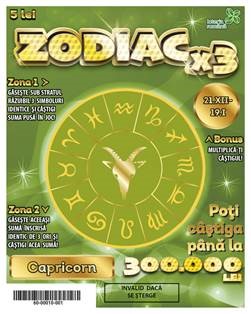 “ZODIAC x 3” este lozul care pune accent pe forta astrelor. Norocul, chiar daca este schimbator, este mereu de partea celor care isi incearca sansa. Fie ca jucatorii aleg sa razuiasca propria zodie sau oricare alta din cele 12 ale zodiacului, premiile substantiale asteapta sa fie descoperite in oricare dintre agentiile loto. Cei care vor sa-si incerce norocul cu acest loz care are trei zone de joc, trebuie sa plateasca doar 5 lei. Valoarea totala a premiilor oferite de LOTERIA ROMANA pentru acest produs loteristic este de 9.650.000 de lei, iar cele 981.619 castiguri totale sunt distribuite in premii de 5 lei, 10 lei, 15 lei, 20 lei, 50 de lei, precum si 100 de lei, 500 de lei, 1.000, 10.000 de lei si 50.000 de lei. Cele mai mari premii care pot fi castigate sunt in valoare 300.000 de lei fiecare.